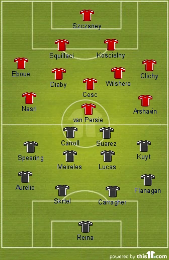 Probable Starting XI: Szczsney, Eboue, Squillaci, Koscielny, Clichy, Diaby, Wilshere, Cesc, Arshavin, Nasri, van Persie