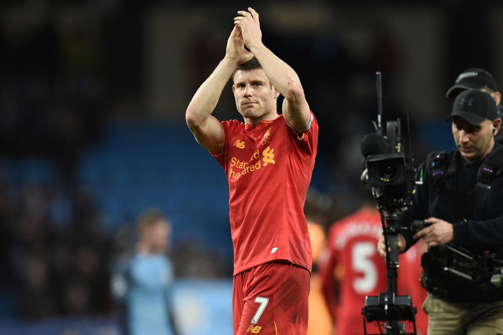 Liverpool's English midfielder James Milner applauds supporters on the pitch after the English Premier League football match between Manchester City and Liverpool at the Etihad Stadium in Manchester, north west England, on March 19, 2017. The game finished 1-1. / AFP PHOTO / Oli SCARFF / RESTRICTED TO EDITORIAL USE. No use with unauthorized audio, video, data, fixture lists, club/league logos or 'live' services. Online in-match use limited to 75 images, no video emulation. No use in betting, games or single club/league/player publications. / (Photo credit should read OLI SCARFF/AFP/Getty Images)