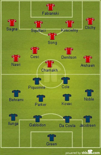 Probable Starting Eleven: Fabianski, Sagna, Squillaci, Koscielny, Clichy, Song, Fabregas, Denilson, Nasri, Arshavin, Chamakh