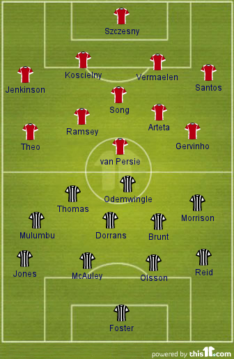 As far as team news go, the defensive pairing of Olsson and McAuley will have their task cut out, having to deal with the might of Robin van Persie. The wide men, Reid and Jones, won’t have it easy either, Gervinho and Theo Walcott will run at them all day long. The West Brom midfield will be packed with five players, though Jerome Thomas, will be ahead of the bunch on the left side of the field. James Morrison will ply his trade on the right side, giving company to Mulumbu, Dorrans and Chris Brunt. A decent goal-threat – Odemwingie – will play up-front and will look to the end the goals-misery of the traveling party.