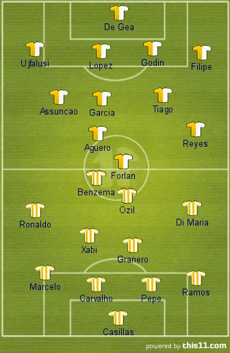 Possible Starting XI (4-4-2): David De Gea, Lopez, Godin, Filipe, Ujfalusi, Garcia, Tiago, Assuncao, Reyes, Forlan, Aguero