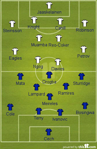 Coyle will set his team up in a 4-4-2 formation, in two banks of four. The defense, which has looked very shaky this season, will comprise of Steinsson, Knight, Cahill, and Robinson. The central midfield will be marshaled by Muamba and Reo-Coker, who will look to rein in the three-man midfield of Chelsea. David Ngog and Kevin Davies will be flanked by Petrov and Eagles, on the left and right wing, respectively.