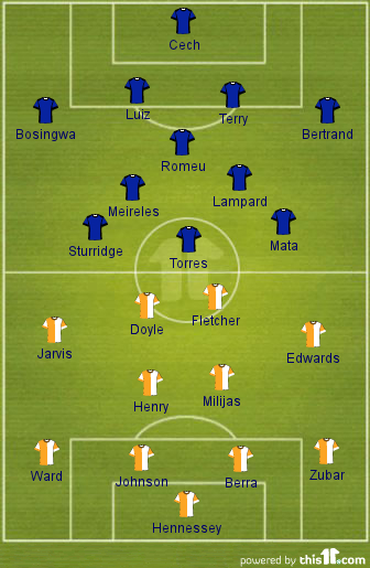 Probable Starting Line-up (4-3-3): Cech, Bosingwa, Luiz, Terry, Bertrand, Romeu, Meireles, Lampard, Mata, Sturridge, Torres