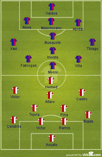 Probable Starting Lineup: Victor ValdAi??s(GK); Eric Abidal, Javier Mascherano, Daniel Alves; Sergio Busquets, Xavi Hernandez, AndrAi??s Iniesta, Thiago Alcantara; Francesc Fabregas, Lionel Messi, David Villa