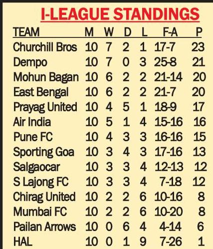 Round 10 saw Dempo dislodged from top of I-League table for the first time this season as Air India continued to surprise I-League experts. Prayag Unitedai??i??s unbeaten record was also broken as they slumped to a loss against Chirag Kerala. Churchill Brothers took hold of the top position with the Kolkata giants failed to win their respective matches.