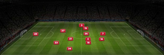 Note: Look at Welbeck playing as a withdrawn forward with Giggs, Jones and Fletcher holding the midfield at the half line showing United’s lack of attacking intent,A�untilA�Hernandez replaced Jones.