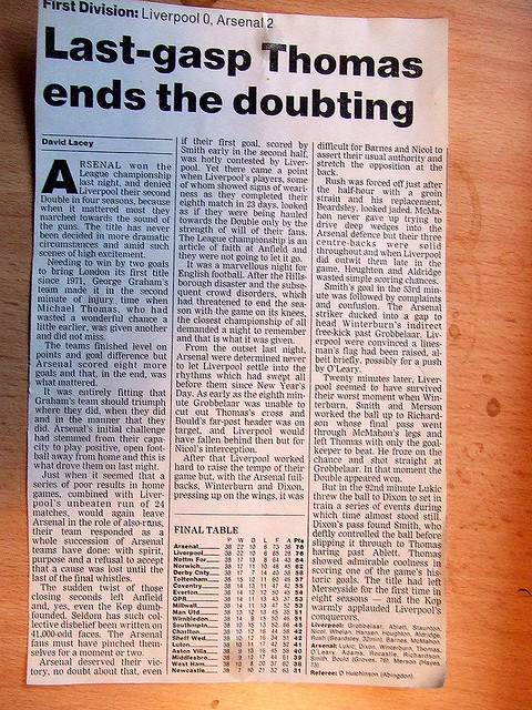 “Arsenal come streaming forward now in surely what will be their last attack. A good ball by Dixon, finding Smith, for Thomas, charging through the midfield. Thomas, it’s up for grabs now!”