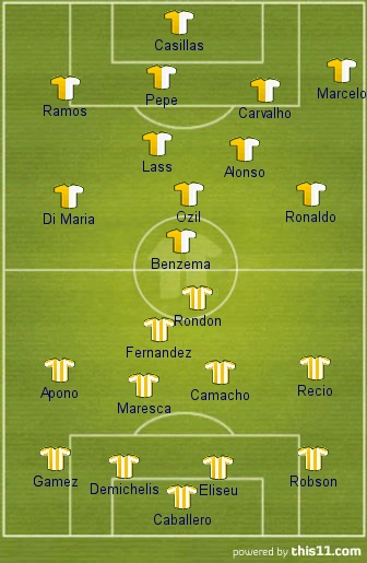 Probable starting line up: Casillas, Ramos, Pepe, Carvalho, Marcelo, Lass, Xabi, Ozil, Ronaldo, Di Maria, Adebayor