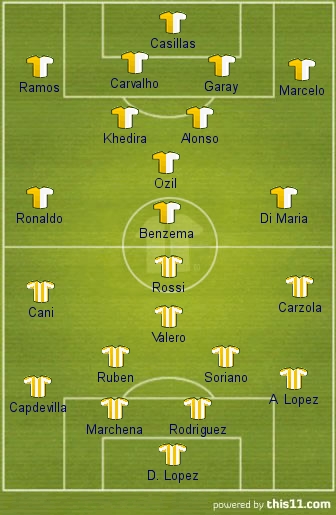 Possible starting line-up(4-2-3-1): Casillas, Ramos, Albiol, Carvalho, Marcelo, Lass, Alonso, Ronaldo, Di Maria, Ozil, Benzema