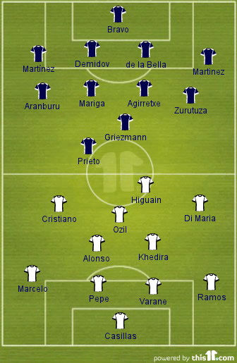 Probable Formation (4-4-1-1) : Claudio Bravo; IAi??igo MartAi??nez, Vadim Demidov, Alberto de la Bella, Carlos Martinez; Mikel Aranburu, McDonald Mariga, Imanol Agirretxe, David Zurutuza, Antoine Griezmann, Xabi Prieto