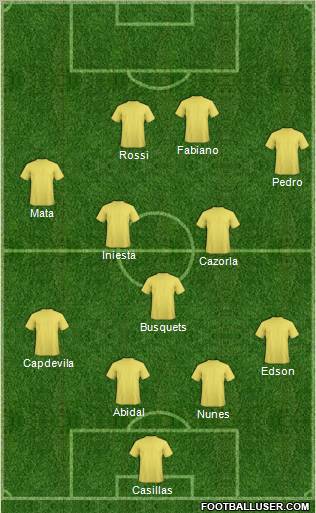 Casillas, Capdevila, Abidal, Nunes, Edson, Busquets, Cazorla, Iniesta, Mata, Pedro, Rossi, Luis Fabiano