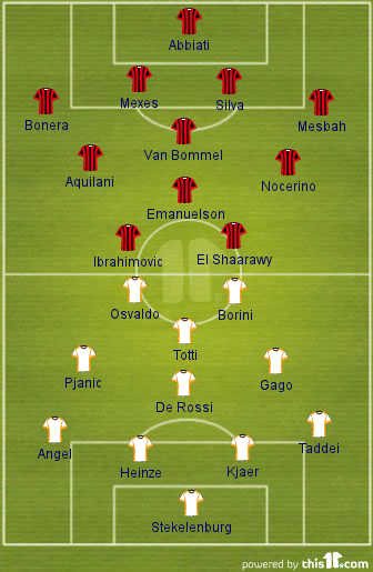 Probable Starting Line-up (4-3-1-2): Stekelenburg(GK); Taddei, Kjaer, Heinze, Angel; Gago, De Rossi, Pjanic; Totti; Borini, Osvaldo