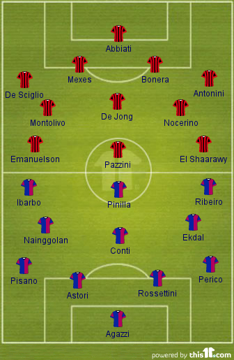 Probable Starting Lineup (4-3-3): Abbiati; De Sciglio, Mexes, Bonera, Antonini; Montolivo, De Jong, Nocerino; Emanuelson, Pazzini, El Shaarawy