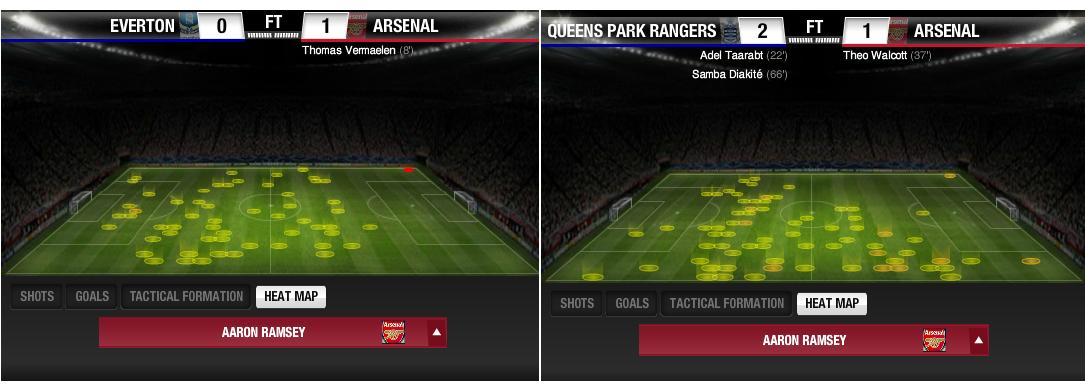 If one takes a good look into the heat map depicted above, it clearly shows how Ramsey, despite being played as a winger/wide attacker, cuts back inside, instead of maintaining the width.