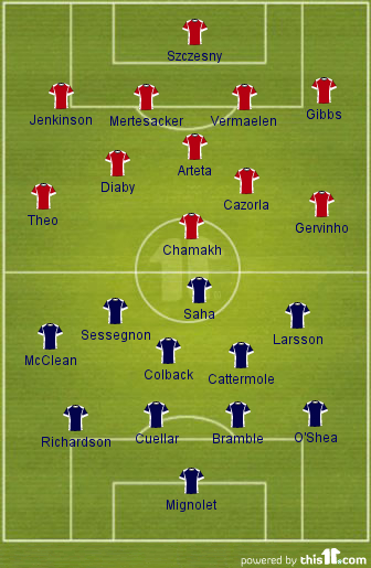 Probable Starting Lineup (4-2-3-1):Ai??Szczesny(GK); Jenkinson, Mertesacker, Vermaelen, Gibbs; Diaby, Arteta; Cazorla, Theo, Gervinho, Chamakh