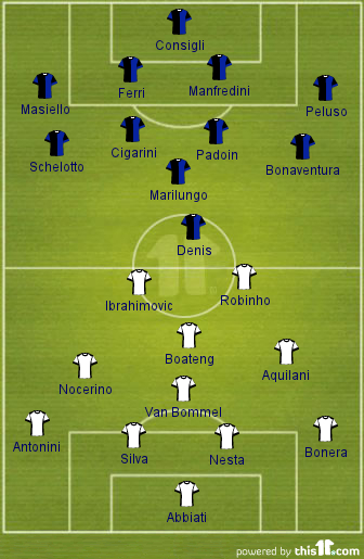 Probable starting line-up (4-3-1-2): Abbiati(GK); Bonera, Nesta, Silva, Antonini; Aquilani, Van Bommel, Nocerino; Boateng; Ibrahimovic, Robinho