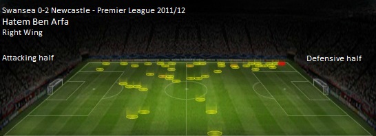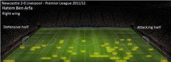 It was the firstAi??of this month, when Newcastleai??i??s European ambitions were to be be tested. Liverpool were in town and three old boys in Bellamy, Carroll and Enrique were trying to make a statement on why they had left their former clubs. However, as the match rolled on, the new boys on Tyneside dictated terms and one in particular, was running the Liverpool midfield into a frenzy. Apart from his attacking prowess, Ben Arfa was seen deep into his defensive half (above heat map) in order to shield his full back and collect the ball as well.Ai??The Geordies weren’t accustomed to such displays from the man.