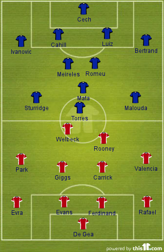 Up front, Rooney is expected to start in his familiar role behind the front striker who could be either Welbeck or Chicharito. While the Englishman has been ahead of the Mexican in the pecking order, Sir Alex might also go for Hernandez up front considering his performances against the Blues last season and also the fact that he looked much sharper and closer to his best form in the game against Stoke on Tuesday. Either way, Hernandez is expected to be involved in the game at least as a substitute later in the game to run behind the tired Chelsea defence.