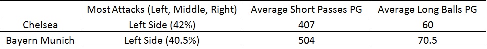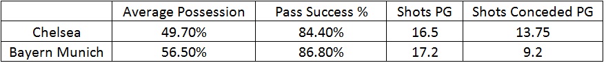 Bayern Munich are better at keeping the ball, infact the interesting fact about this match is that Bayern are better with the ball while Chelsea are better off it. One can be deceived by the number of shots conceded per game for Chelsea, but it must be put under consideration that this number is inflated firstly by the matches played under AVB, when the Blues were a far more open side and secondly because of the match against Barcelona.