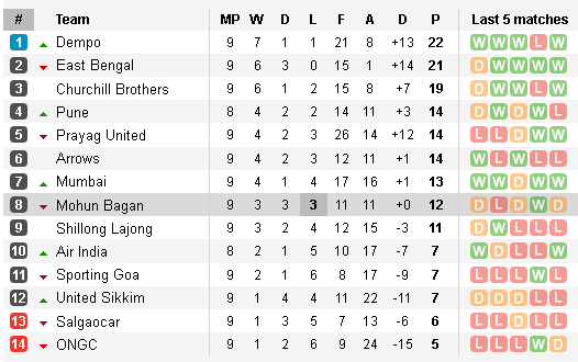 Ai??With East Bengal failing to hit the back of the net in Shillong, Dempo clinch the top spot as the round nine matches fade off. Both the custodians, L. Ralte and Gurpreet Singh Sandhu came up with vital saves to help their respective sides share points. Shillong Lajong finishes the round with eleven points, while the Red-&-Gold Brigade finishes at the second position with twenty one points.