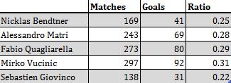 Below is a comparison of their goal scoring records. Stats are pretty neck and neck. Matri has spent most of his career at small clubs and has really improved in past 3 seasons unlike Bendtner whose career has somewhat digressed after a car crash and an injury that followed the accident. Except Vucinic, none of the other Juventus strikers have had the luxury of playing with quality team mates like the way Bendtner has.