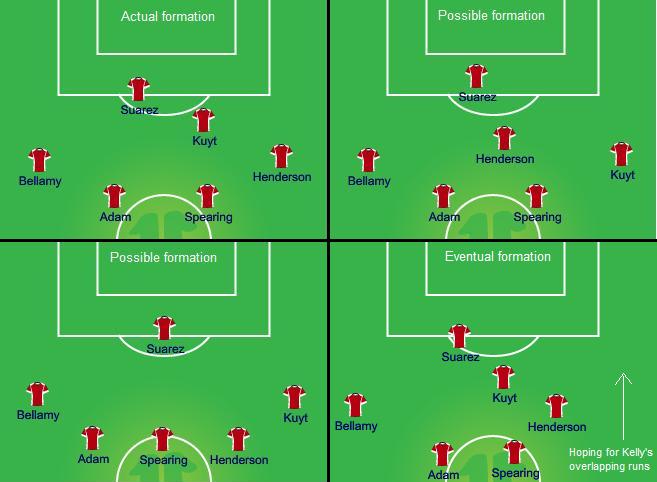 Kenny Dalglish couldai??i??ve realistically chosen one of three formations to play with the line-up he had selected; all involving variations in Hendersonai??i??s positions. The ex-Sunderland midfielder couldai??i??ve played as a right winger, a third central midfielder or an attacking midfielder behind Suarez. In the end, he was neither of the three with what didnai??i??t look like a defined role ai??i?? but presumably, a right-sided midfield role ai??i?? and he ended up putting in a performance not worthy of starting in a Sunderland team, let alone a Liverpool one.