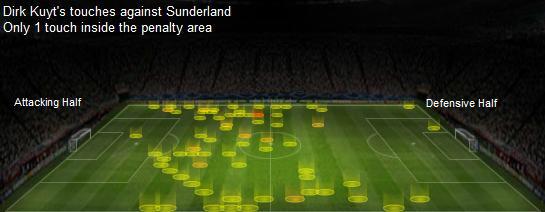 Dirk Kuyt wasnai??i??t playing on the right side of midfield, which was refreshing to see, but wasnai??i??t playing as a full striker either. He was roaming behind Suarez trying to link up the Uruguayan with the midfield and was rarely seen in a position that gave him a chance to score (as can be seen from the below figure).