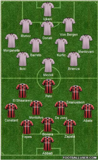 Probable Starting Line-up (3-4-2-1): Abbiati (GK); Zapata, Bonera, Yepes; Abate, De Jong, Montolivo, Constant;Ai??Emanuelson, El Shaarawy; Pato