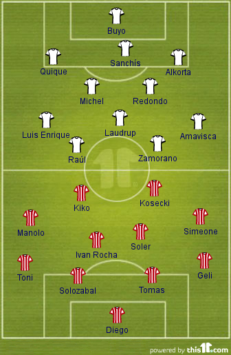 And so onto the night when a bitter derby was being played out at Santiago BernabAi??u. Real Madrid had an uncertain start to the season under Jorge Valdano while Atletico Madrid were themselves facing a nightmarish season, a season during the course of which they will go on to play under four managers. On the night, Valdano fielded a more adventurous side, putting out a back three to offer more creativity up front, while Atletico came out more defensive trying to man-mark players and shore up things in the midfield. Current Atletico manager Diego Simeone was in the line-up that day.