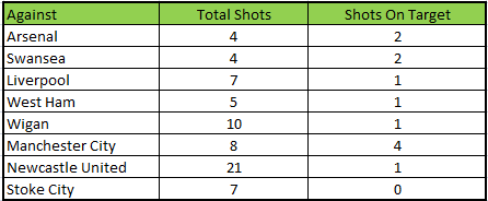 The above table shows the statistics of the total shot and number of shots on target during the Sunderlandai??i??s Premier League matches this season. Sunderland have taken a total of 12 shots on target in eight matches in the League this season, which is the lowest in the league; that is less than two shots on target per game. The low point of this season came in the match against Stoke City when Sunderland failed to hit the target even once throughout the match.