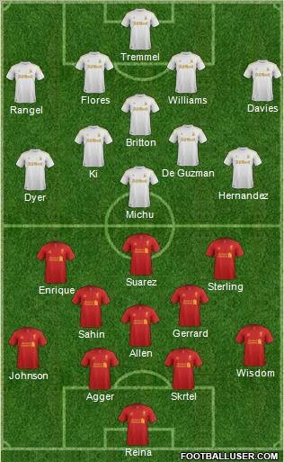 Like his counterpart at Liverpool, Michael Laudrup also prefers to have his team lined up in a 4-3-3 formation. Tremmel is expected to keep goal in Vormai??i??s absence. He will be protected by the back four of Rangel, Flores, Williams and Davies. Ashley Williams had plenty to say about Suarez in the build-up to the game and their clash on the pitch will make for some interesting viewing.
