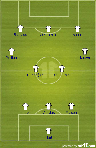 Honourable mentions: Christian Abbiati (Milan), Alex Sandro (FC Porto), Weligton (Malaga), Yevhen Khacheridi (Dynamo Kiev), Joao Moutinho (FC Porto), Julian Draxler (Schalke 04), Juan Mata (Chelsea), Mario GAi??tze (Borussia Dortmund), Hulk (Zenit St Petersburg), Emmanuel Emenike (Spartak Moscow)