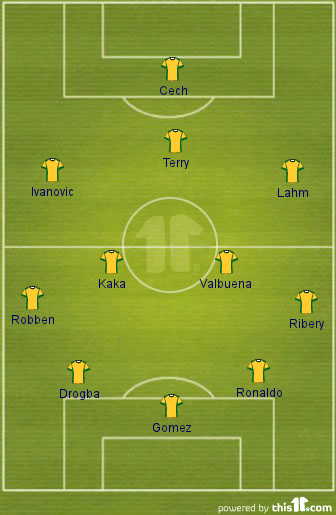 Peter Cech (Chelsea); Branislav Ivanovic (Chelsea), John Terry (Chelsea), Phillipe Lahm (Bayern); Arjen Robben (Bayern), Kaka (Real Madrid), Mathieu Valbuena (Marseille), Franck Ribery (Bayern); Didier Drogba (Chelsea), Mario Gomez (Bayern), Cristiano Ronaldo (Real Madrid)