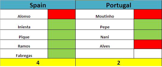 The problem for Bento was that he hardly had the kind of resource on the bench as Del Bosque had. So it was hard for him to make changes despite growing fatigue within the team. This also resulted in Spain growing in the match as their passing was back to its best. Bento finally made two changes as he brought on Custodio and Varela in the place of Veloso and Meireles as Portugal prepared for penalty kicks.
