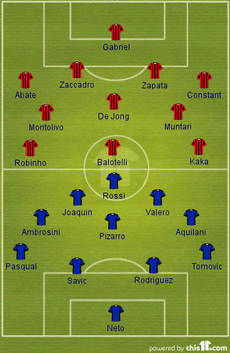 Probable Starting Lineup [4-3-3]: Gabriel; Abate, Zaccardo, Zapata, Constant; Montolivo, De Jong, Muntari; Robinho, Balotelli, Kaka