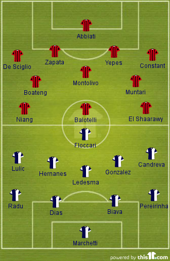 Probable Starting Lineup (4-3-3): Abbiati(GK); De Sciglio, Zapata, Yepes, Constant; Boateng, Montolivo, Muntari; Niang, Balotelli, El Shaarawy