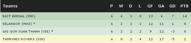 East BengalAi??finished the Group H at the top with fourteen points garnered, best by any Indian club since the inception of AFC Cup. East Bengal now lock horns against Yangon United of Myanmar, who are too unbeaten in the competition, on 15th May.