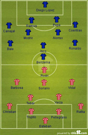 Expected Line-Up-Diego Lopez-Ramos-Pepe-Carvajal-Coentrao-Alonso-Modric-Isco-Ronaldo-Bale-Benzema