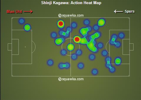 Comparing the above heat-map of Kagawa with that of Rooney, one can clearly notice the stark difference in the sprinkling of the green patches across the pitch. Whereas Rooney covered almost the entire pitch, Kagawa for a major portion of the game, operated between the lines of the Spurs’ midfield and defense. His inability to drop back when not in possession, coupled with the presence of both Scholes and Giggs in the starting XI meant that the United midfield were run ragged in the first half by a rampant Spurs who lifted their Old Trafford hoodoo that evening.