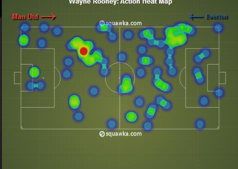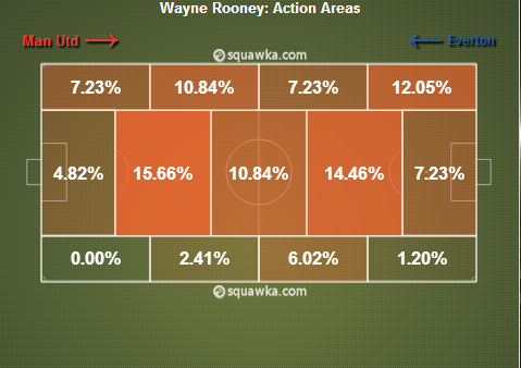 The following heat-map depicting Wayne Rooney’s action zones in the 2-0 win against David Moyes’ Everton back in February give ample evidence about Rooney’s all-round capabilities. The sprinkling of green and blue dots all over the pitch depict the different positions taken up by the forward during the game. Rooney made a total of 5 clearances, and a couple of tackles alongside having completed 36 out of 40 passes in the game, finishing with a pass completion rate of 90%