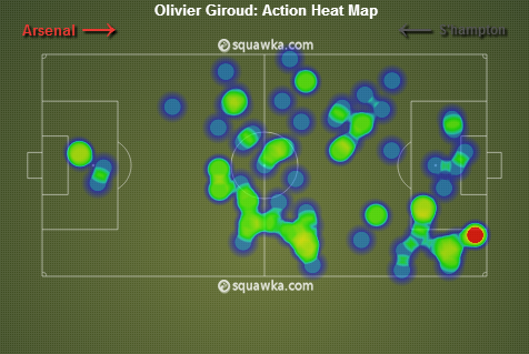Olivier Giroud produced a wonderful performance upfront and win this game for the Gunners. He was a constant threat for the Southampton defence and once again showed how far he has improved as a striker this season. His hold up play was brilliant and he won nearly everything in air and everything that was thrown at him. He deserved the goals for his hard work, not only in attack but also played a crucial part in defending set-pieces against Southampton. The above heat-map depicts his movement and positioning on the pitch in the game.