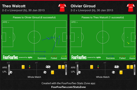 One of Giroud’s natural strengths is to hold up play and have attacking players running for his flickons and knock downs. At Montpellier he had the mobile Younes Belhanda to receive the ball. At Arsenal it’s Theo Walcott who is the ideal runner for the Frenchman, and it’s only natural that they have gelled in as well as they have.