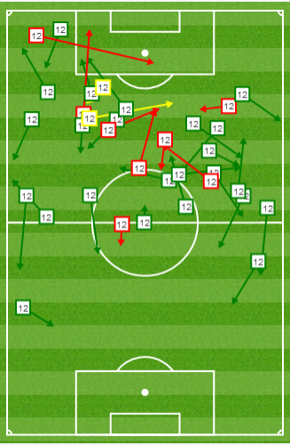 Like every team and every striker, sometimes things don’t work out and don’t fall on a plate. When strikers don’t get any joy upfield, they drop deep to create something for themselves; but with Giroud it’s about contributing to the general flow of the attack by being a deeper fulcrum. The graphic below displays his passes against Liverpool where one clearly note how deep he drops in order to influence the play. He might not have the passing range of an Ozil or a Rosicky, but he is smart enough to spot the movement of his fellow attackers and keeps them on their feet with a gentle layup or at other times dribbling forward with the runners acting as decoy to relieve him of his marker. The fact that he has combined so well with Ramsey and Ozil in particular is because of the duo’s tireless running.