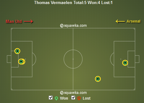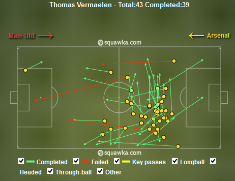 Defensively he was faultless and the statistics further highlight how effective Vermaelen was. His passing was of the highest order, having completed 39 out of his 43 attempted passes, Vermanelen registered a 91% pass completion average. Only Mikel Arteta(94%) and Phil Jones(95%) managed to record a better overall pass success rate.