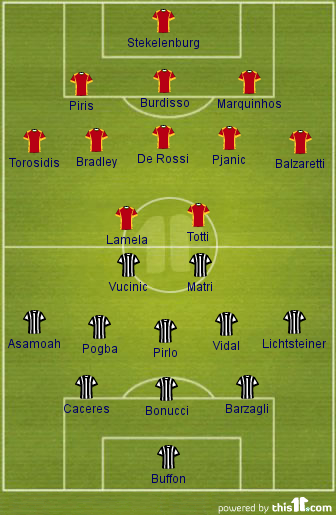 Probable Starting Line-up (3-5-2): Stekelenburg; Piris, Burdisso, Marquinhos; Torosidis, Bradley, De Rossi, Pjanic, Balzaretti; Lamela, Totti