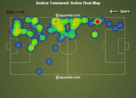 Andros Townsend has been the talk of the town recently. After shining for England in the World Cup Qualifiers and recently signing a new contract, the young winger continued to dazzle for his club. Townsend was easily the most dangerous attacker on the pitch and scored the opener in the first half, although it didnai??i??t come from an intended shot. But he was provided with a lot of space in the second half and he Luna a torrid time down his side. The above heat map shows his movement and positioning on the pitch against Villa.