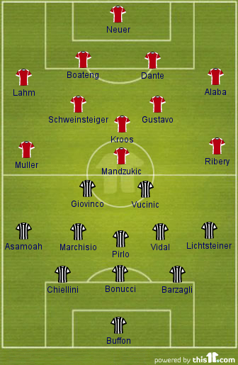 The defense remains untouched and will aim to remain compact. The wing-backs are vital in this clash as Bayern tend to exploit the quality of Ribery and Muller. Asamoah and Lichtsteiner have a tough job on their hands but a job they are nevertheless, capable of handling. Expect the Swiss International to be the more adventurous of the duo and support the forwards with his typically energetic runs. In attack, Vucinic is expected to start after shaking off a fever. Itai??i??s these kinds of games that bring out the best in the Montenegrin and Conte will turn once again to his enigmatic striker in the hope that he pulls off a vintage ai???big gameai??i?? display.