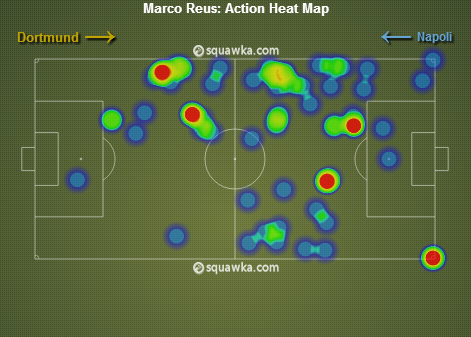 Marco Reus produced a brilliant performance in attack for Dortmund last night. The German club needed its big players to deliver on such a crucial game and Reus delivered. He scored the first goal with a well-taken penalty and set up Blaszczykowski to score the second. The 24-year-old was a constant threat on the counter-attacks with his pace and direct running and created numerous opportunities for side, although they failed to convert most of them. The above heat-map depicts his movement and positioning on the pitch against the Italian side last night.