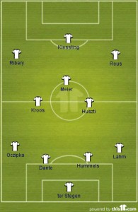 Defensive replacements are in the form of Leverkusenai??i??s center back Wollscheid, who has been instrumental in allowing Leverkusen to quickly adapt to their new 4-3-3 formation. Dortmund left back Schmelzer too finds his place with some sound display. Teammate Castro, Bayernai??i??s Thomas Muller and Dortmundai??i??s Mario Gotze find themselves on the bench as well.