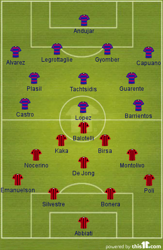 Kakaai??i??s resurgence has easily been the story of the season for the away side and once again a lot will depend on his individual exploits. Valter Birsa, after scoring a couple of splendid goals early into the season has dried up a bit but his role is still an important one. Balotelli is the main focal point in the attack and must rise to the challenge by putting the disappointments of last few weeks behind him.